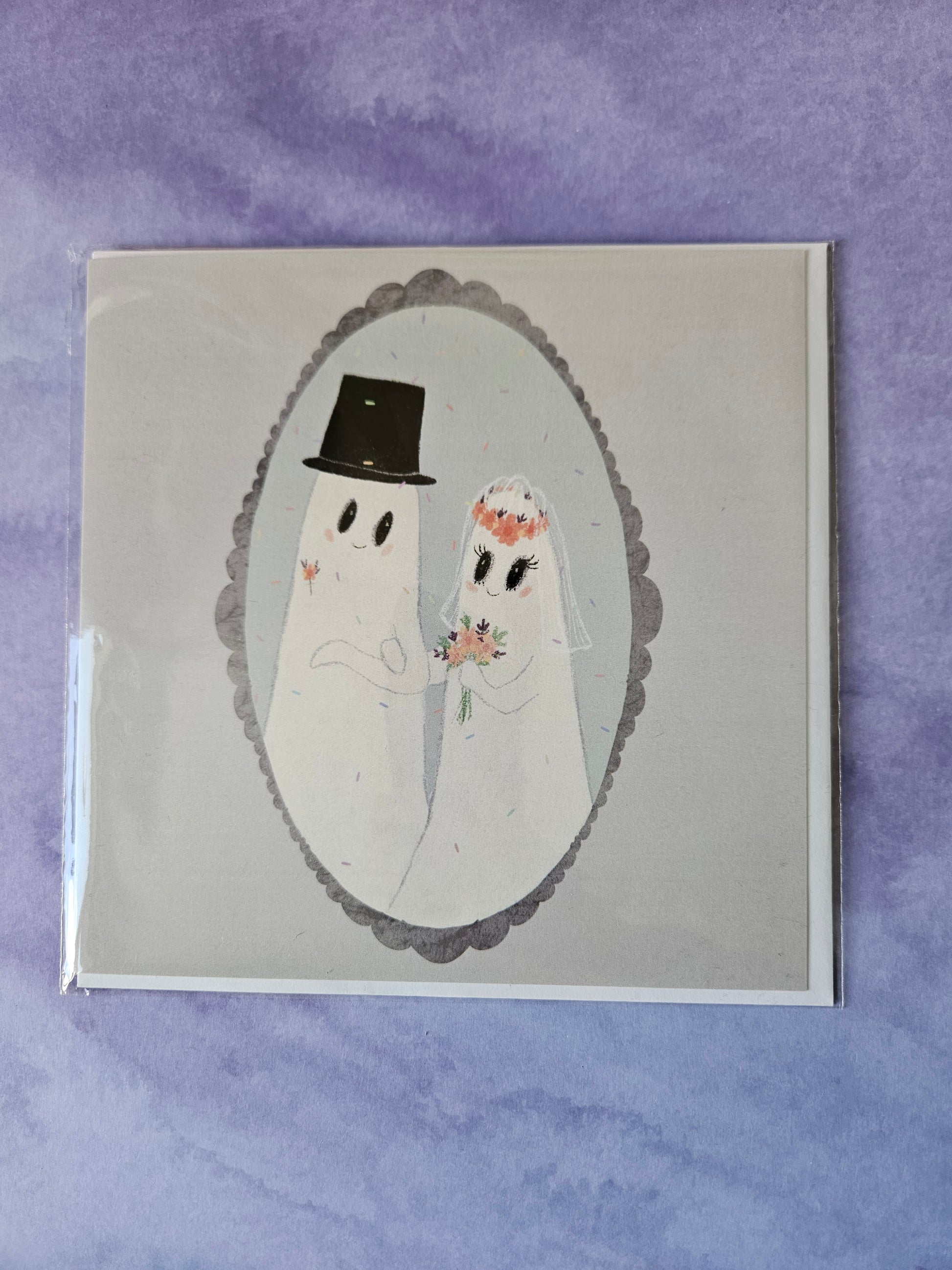 Celebrate love with this sweet ghost bride and groom. This card features my original illustration, created digitally with a nostalgic, coloured pencil aesthetic.